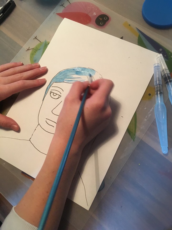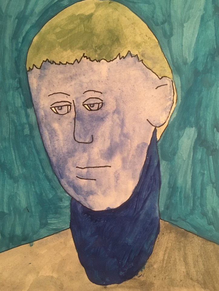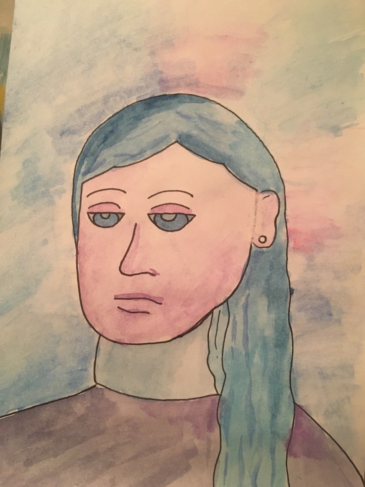 Heute war also das Thema Picassos blaue Periode und die Aufgabe, ein eher trauriges Porträt von sich selber in Blautönen zu malen. Wir haben diese Website als Vorlage gebraucht, aber haben immer blau mit einer anderen Farbe gemischt (also nicht blau und grün).