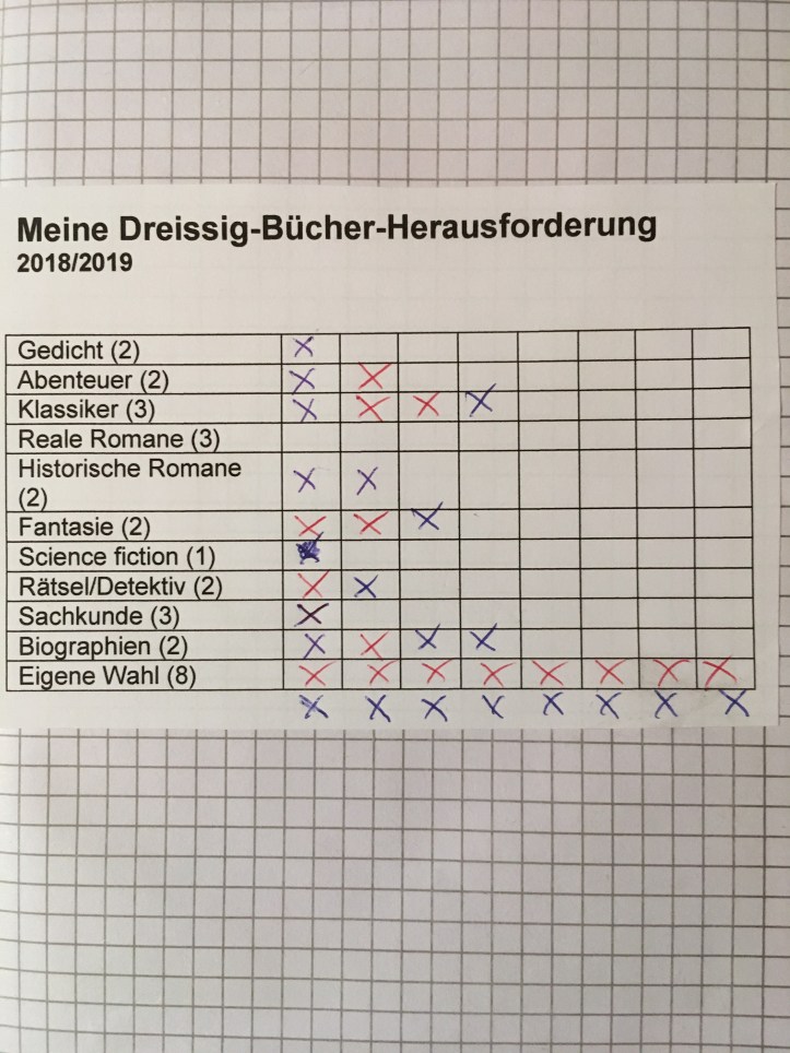 Auch in diesem Schuljahr hatte Schnüggu wieder eine Lese-Herausforderung. Diesmal hatte auch er eine 30-Bücher-Herausforderung (5. Klasse, 10 Jahre alt). Dies schaffte er locker, auch mit den Büchern, die ich den Kindern vorgelesen habe. Dies ist seine diesjährige Liste: