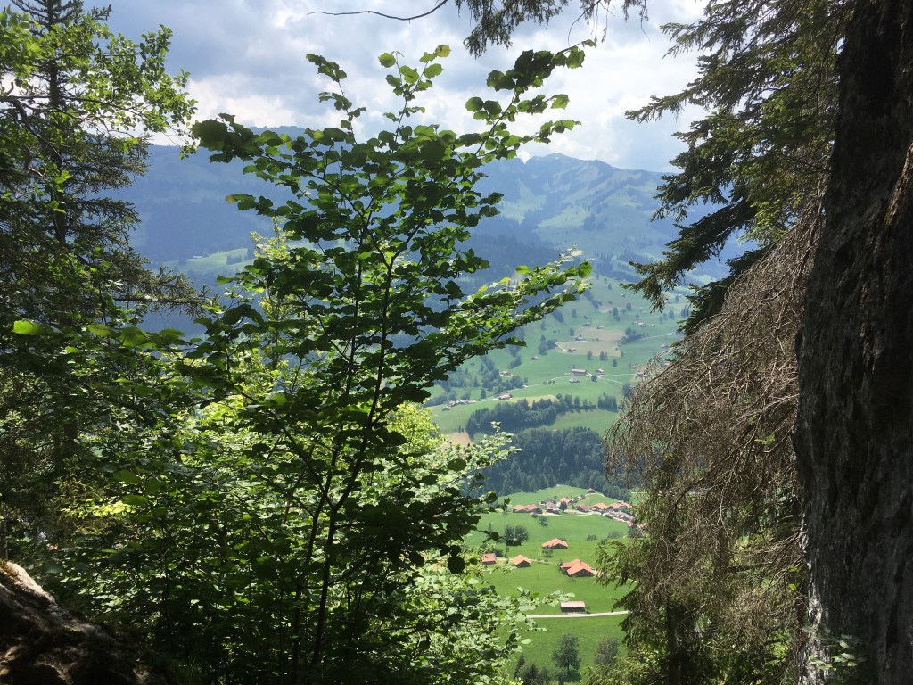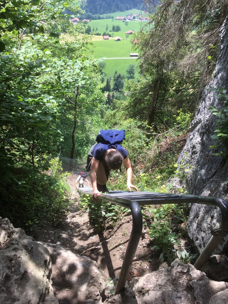 Dieses Jahr waren wir also nur drei Familien und entschieden wir uns dafür, im Berner Oberland den Simmentaler Höhlenpfad zu erforschen. Wir trafen uns in Oberwil am Bahnhof und liefen dann den stotzigen Hang hoch, durch Wald und über Wiesen, bis uns allen die Schweisstropfen vor lauter Anstrengung und Hitze das Gesicht runterliefen.