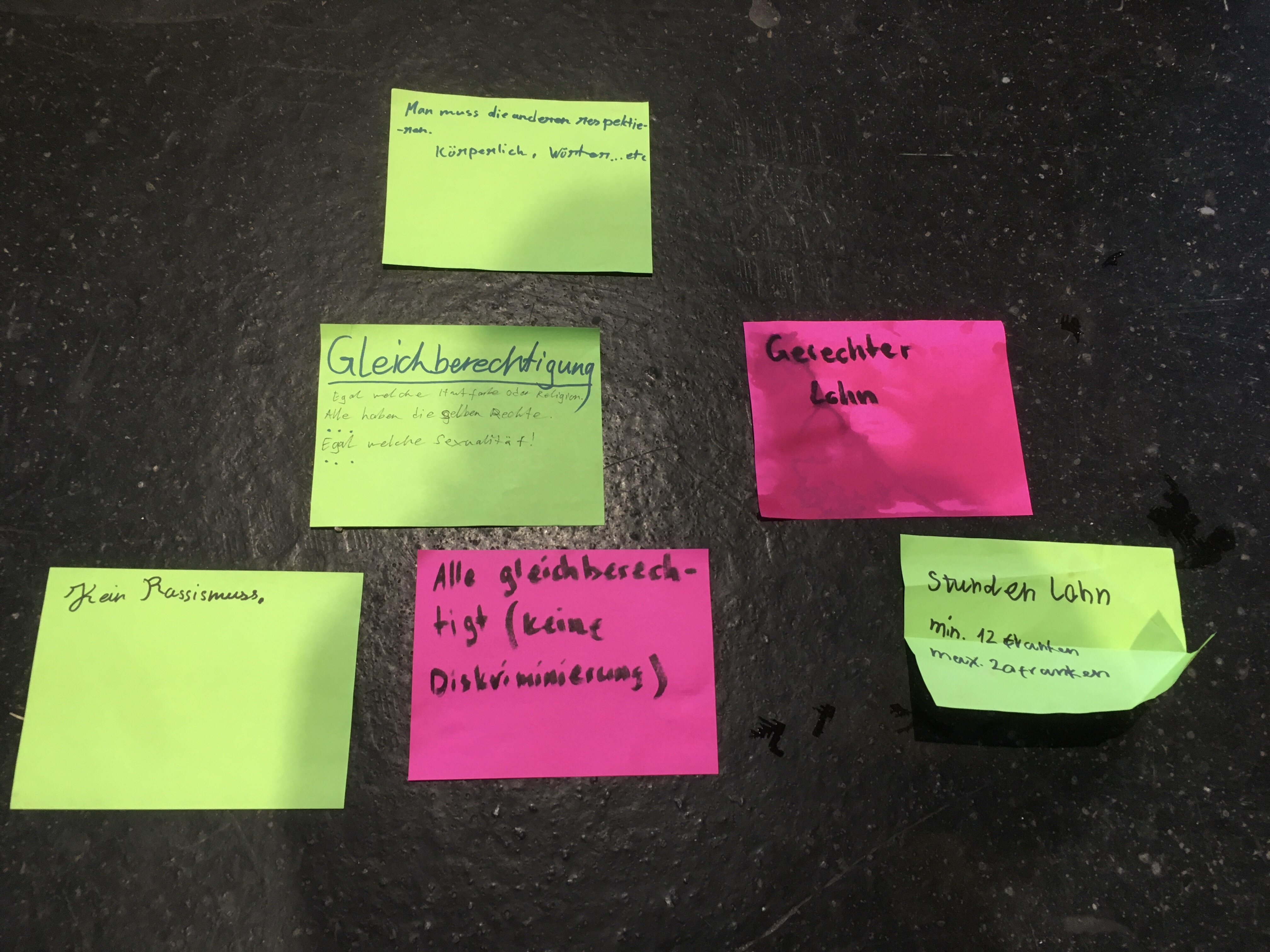 Anschliessend wurde das Spiel und die Bedeutung der Menschenrechte gemeinsam diskutiert und wurden die Jugendlichen dazu aufgefordert, über ihre ideale Welt nachzudenken. Dabei kamen viele interessante Beiträge zusammen.