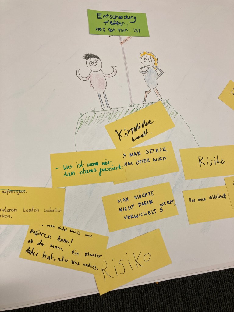 So kam es dazu, dass wir mit Amnesty Schweiz für unsere Oberstüfler einen halbtägigen Workshop zum Thema „Zivilcourage“ organisierten. Der Workshop fing sogleich mit einem Rollenspiel an, was den Hauptteil des Workshops ausmachen würde. Es wurde viel ganz praktisch gespielt und geübt und zwar sowohl die Rolle als „Opfer“, als auch die Rolle als „Beisteher/Zuschauer“. Wie verhält man sich richtig, wenn man bedrängt wird? Wie sollte man sich verhalten, wenn man das mitbekommt? Auch wurde die Theorie zum Thema Zivilcourage angeschaut. Warum zeigen so wenige Menschen Zivilcourage? Worum geht es bei den Begriffen „Bystander-Effekt“ und „Pluralistische Ignoranz“? Wie kann man dem konkret entgegen wirken?