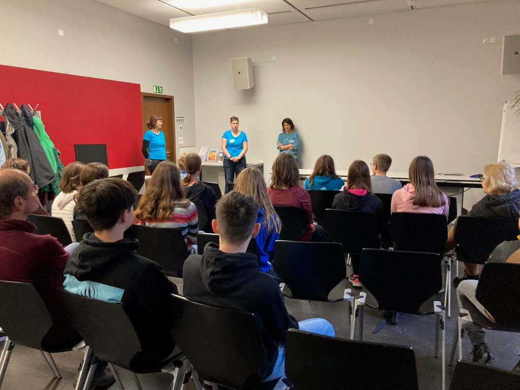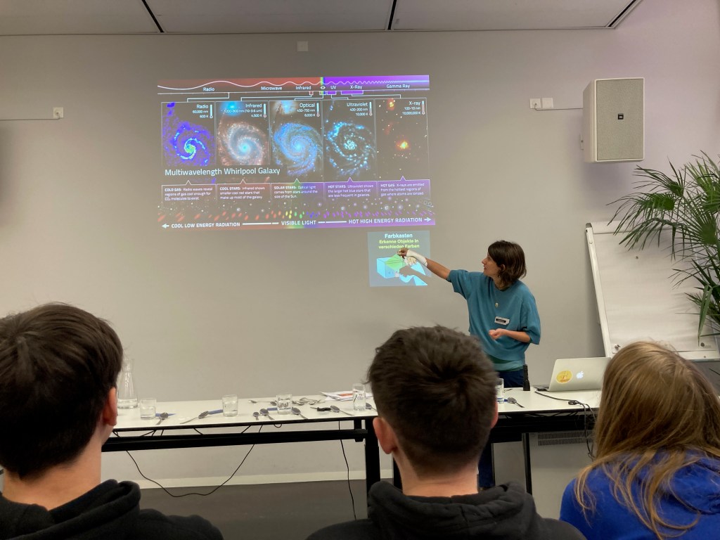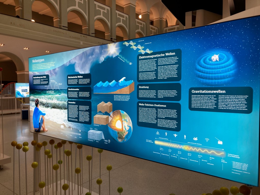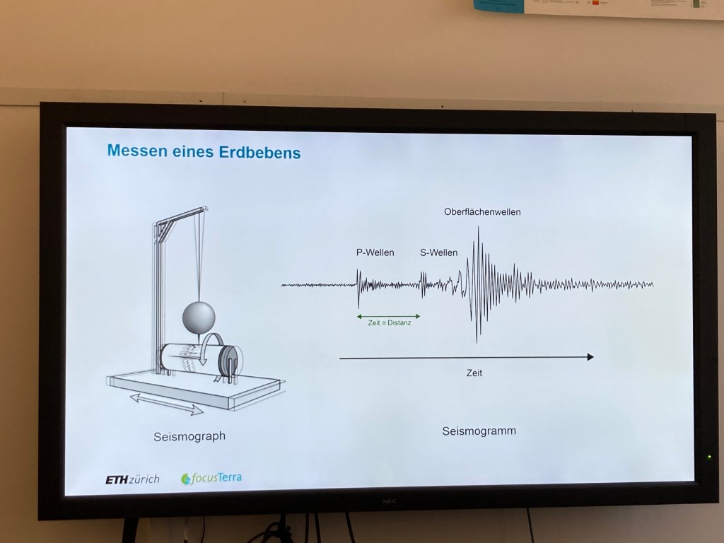 In der Einführung liefen wir durch die Ausstellung und bekamen zu verschiedenen Ständen Erklärungen und durften auch einiges selber ausprobieren (z.B. Infrarotwellen, usw.). Danach wurden wir in drei Gruppen aufgeteilt und lernten so in kleinen Gruppen über Gravitationswellen und allgemein Wellen im Universum, über elektromagnetische Wellen und über Wellen in der Erde. Dabei wurde anhand von Formeln ganz praktisch ausgerechnet, wo das Epizentrum eines Erdbebens ist und durften wir im Erdbebensimulator verschieden heftige Erdbeben spüren.
