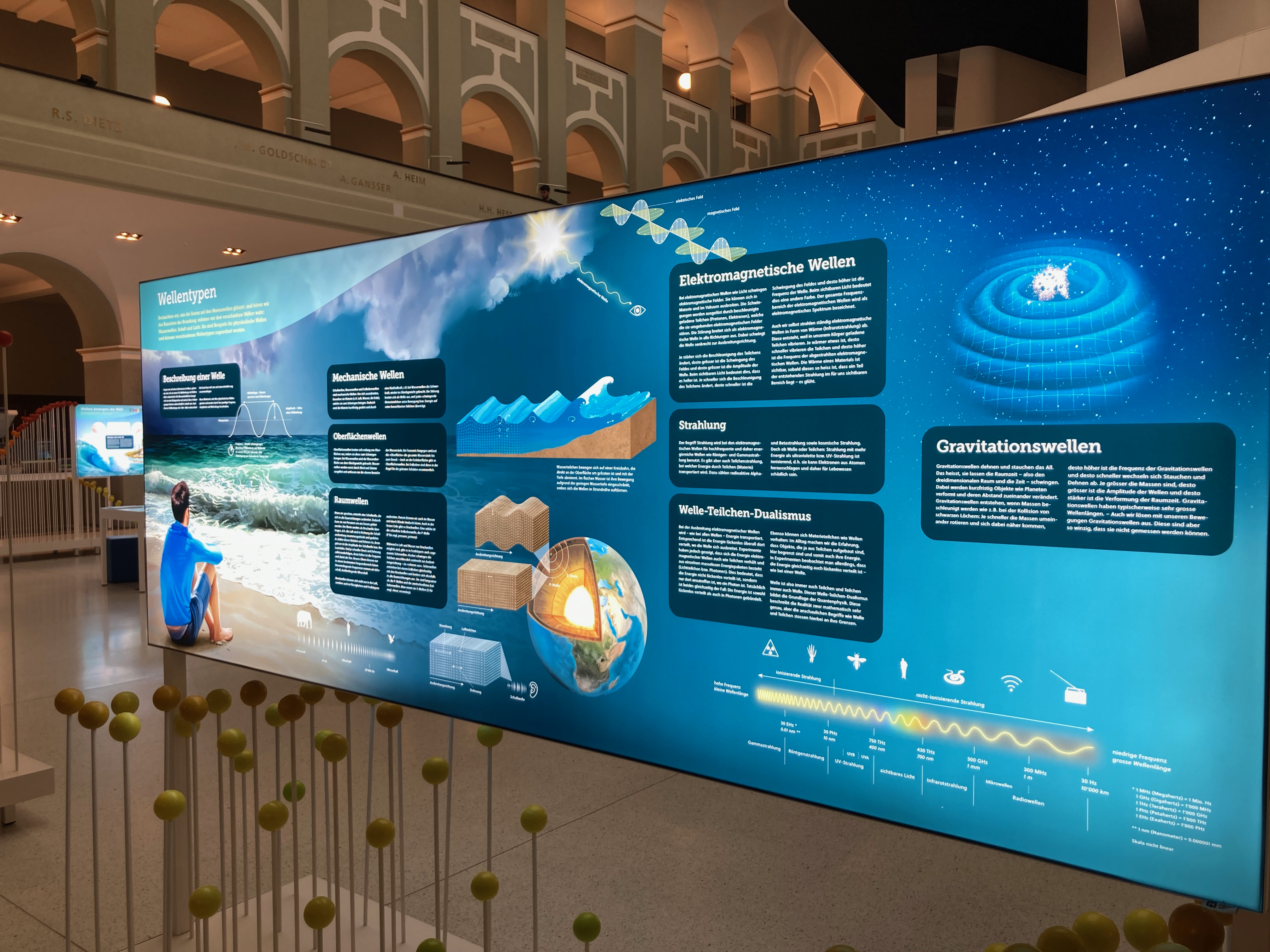 In der Einführung liefen wir durch die Ausstellung und bekamen zu verschiedenen Ständen Erklärungen und durften auch einiges selber ausprobieren (z.B. Infrarotwellen, usw.). Danach wurden wir in drei Gruppen aufgeteilt und lernten so in kleinen Gruppen über Gravitationswellen und allgemein Wellen im Universum, über elektromagnetische Wellen und über Wellen in der Erde. Dabei wurde anhand von Formeln ganz praktisch ausgerechnet, wo das Epizentrum eines Erdbebens ist und durften wir im Erdbebensimulator verschieden heftige Erdbeben spüren.