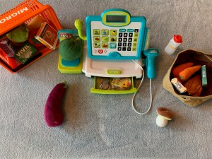 Nach rund dreiviertel Stunde gibt es ein Freispiel, er kann wählen, was er spielen möchte. Heute wählt er den Verkaufsladen. In der Kasse hat es Spielgeld in EUR/CHF, so lernt er bereits im Spiel kennen, dass es unterschiedliches Geld gibt. Er schlüpft in die Rolle des Verkäufers und lässt das Tageskind bei sich einkaufen und führt mit ihr eine Diskussion über die Preise seiner Lebensmittel.