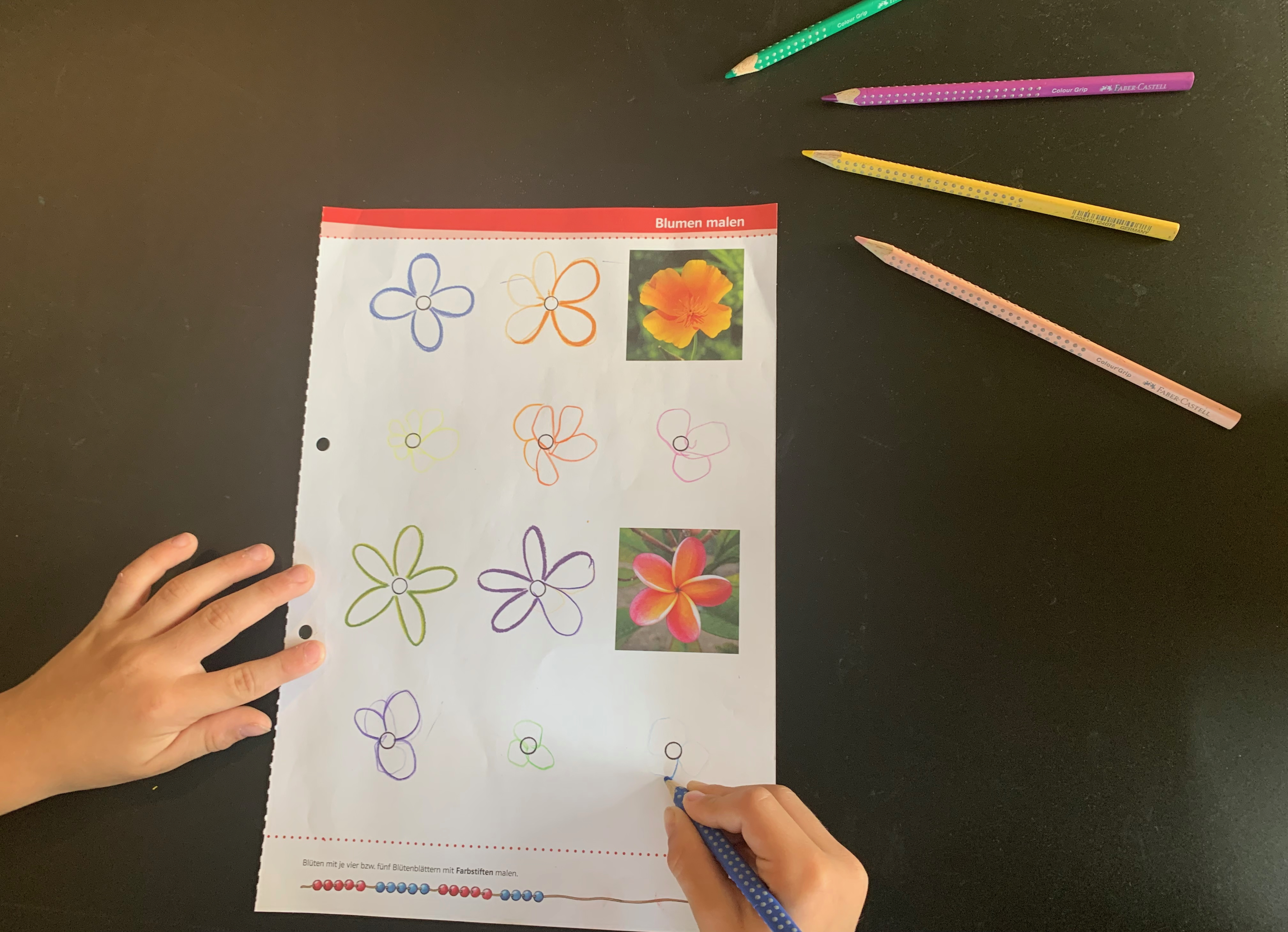 Nach dem Frühstück beginnen wir mit dem Unterricht am Küchentisch. Heute startet Mikko mit Schwungübungen in seinem Übungsheft, er zeichnet sehr genau und konzentriert mit seinem Bleistift ins Heft. Als Ergänzung löst er anschliessend zwei Seiten im Zahlenbuch zur Frühförderung. Dabei lernt er, wie ein Stift korrekt gehalten wird und kommt mit den ersten Formen und Ziffern in Kontakt. Zum Abschluss seiner selbständigen Arbeit macht er noch eine Zeichnung von Lastwagen und Autos.