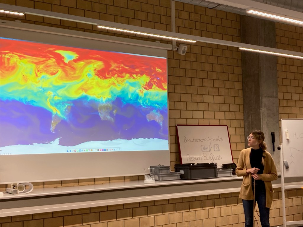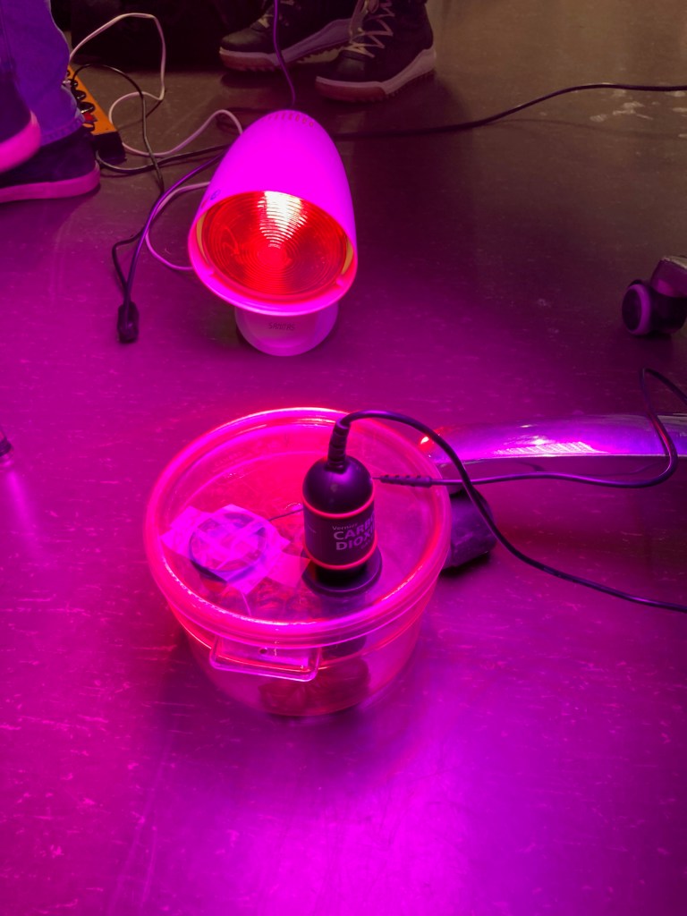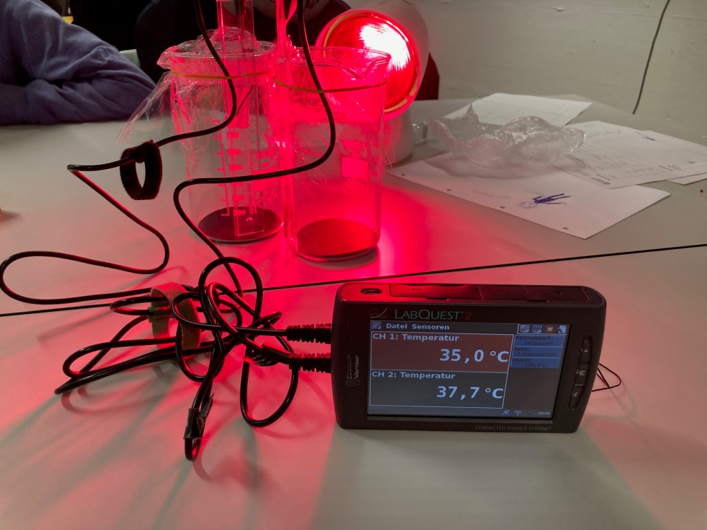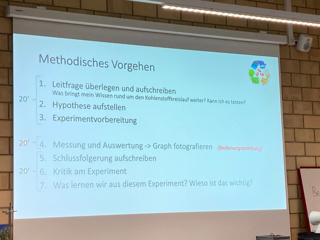 Wir wurden fachkundig in das Thema eingeführt, basiert auf unser vorheriges Wissen. Die Jugendlichen experimentierten zuerst mit dem CO2-Messer, zum Beispiel wurde gemessen, wie viel CO2 in ihrem Atem steckt, wenn sie in ein Plastiksäckchen bliesen. Wir schauten auch CO2 Strömungen auf der Welt an und sahen den Unterschied zwischen dem Norden und dem Süden, dem Sommer und dem Winter. Danach probierten sie aus, wie die Temperatur unterschiedlich stieg, wenn die Luft viel oder weniger CO2 enthielt. Auch schauten wir uns an, wie viel CO2 Pflanzen absorbieren konnten mit Wärme und ohne Wärme und mit Tageslicht und im Dunkeln. Alles spannende Experimente!