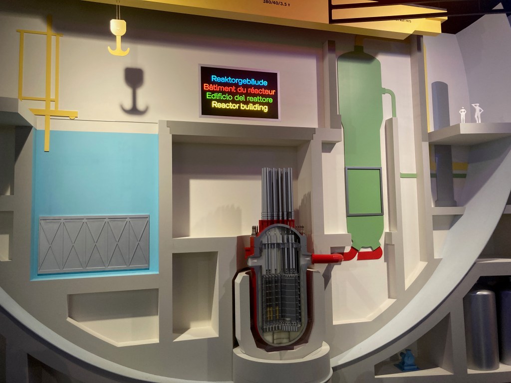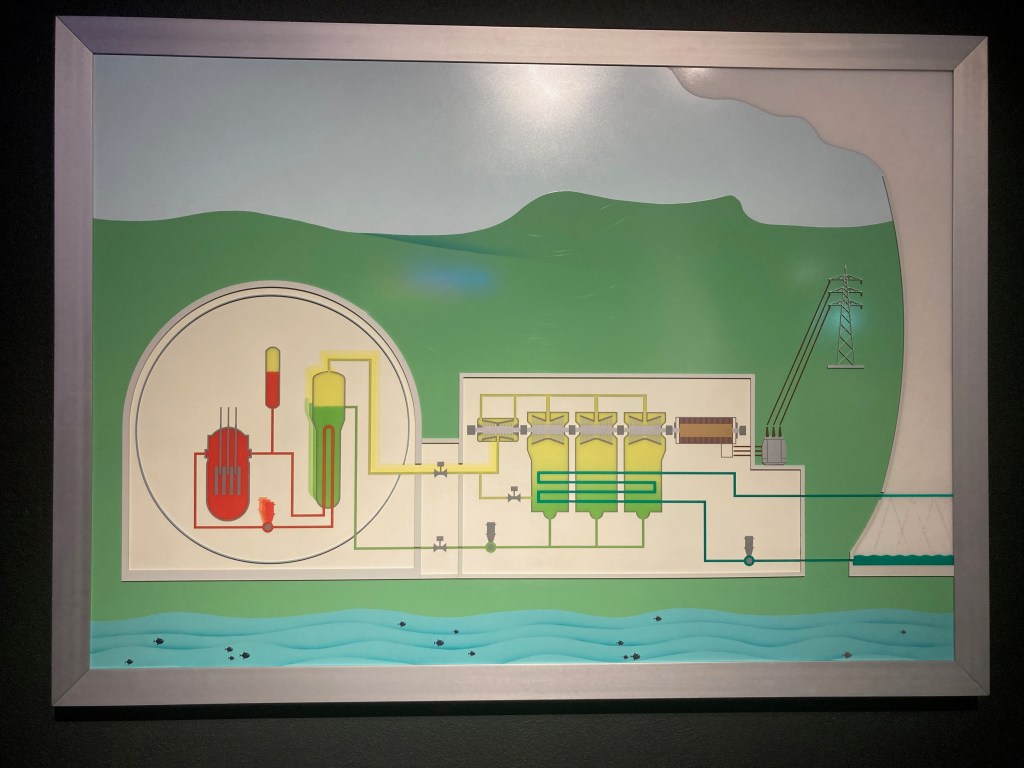Jetzt begreife auch ich, dass aus dem Kühlturm kein radioaktiver Dampf steigt, da der radioaktive Zyklus und der Abkühlungszyklus getrennt sind von einander. Auch habe ich gelernt, dass, obwohl der Turm eindrücklich aussieht, die kleinere Kuppel dort ist, wo die Atomspaltung stattfindet.
